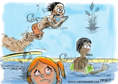 man in a swimming pool filled with floating carrot-noses thinks ...